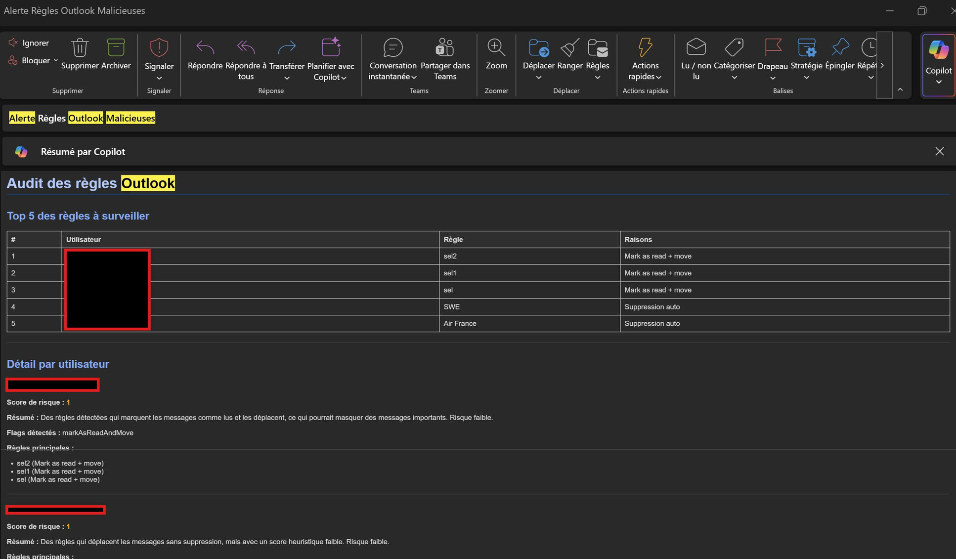Certaines règles Outlook peuvent être utilisées pour masquer des emails, supprimer automatiquement des messages ou rediriger des échanges sensibles sans que l’utilisateur ne s’en rende compte.Provitek réalise un audit automatisé et structuré des règles de messagerie afin d’identifier ces configurations à risque.---"Ce qui est analysé"- règles marquant les messages comme lus et les déplaçant automatiquement